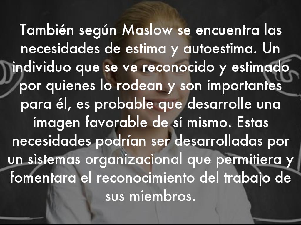 También según Maslow se encuentra las necesidades de estima y autoestima. Un individuo que se ve reconocido y estimado por quienes lo rodean y son importantes para él, es probable que desarrolle una imagen favorable de si mismo. Estas necesidades podrían ser desarrolladas por un sistemas organizacional que permitiera y fomentara el reconocimiento del trabajo de sus miembros.