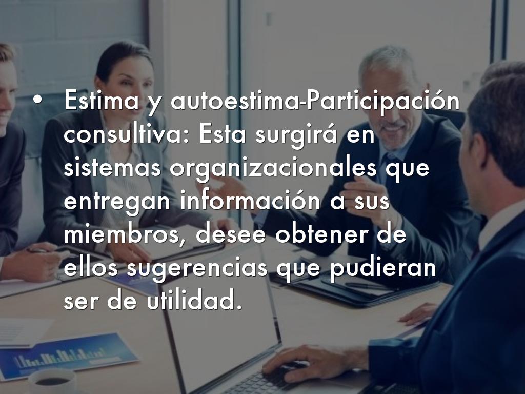 - Estima y autoestima-Participación consultiva: Esta surgirá en sistemas organizacionales que entregan información a sus miembros, desee obtener de ellos sugerencias que pudieran ser de utilidad.