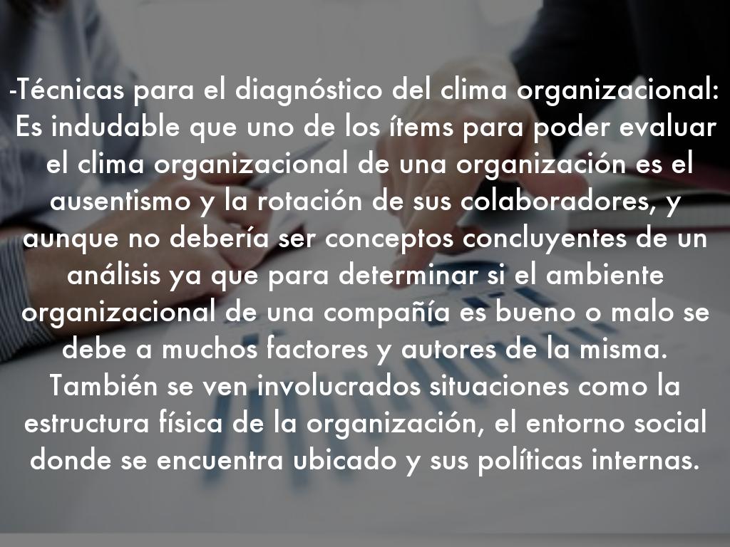 Es indudable que uno de los ítems para poder evaluar el clima organizacional de una organización es el ausentismo y la rotación de sus colaboradores, y aunque no debería ser conceptos concluyentes de un análisis ya que para determinar si el ambiente organizacional de una compañía es bueno o malo se debe a muchos factores y autores de la misma. También se ven involucrados situaciones como la estructura física de la organización, el entorno social donde se encuentra ubicado y sus políticas internas.