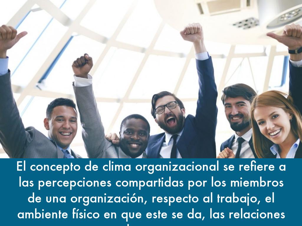El concepto de clima organizacional se refiere a las percepciones compartidas por los miembros de una organización, respecto al trabajo, el ambiente físico en que este se da, las relaciones en el entorno,etc.