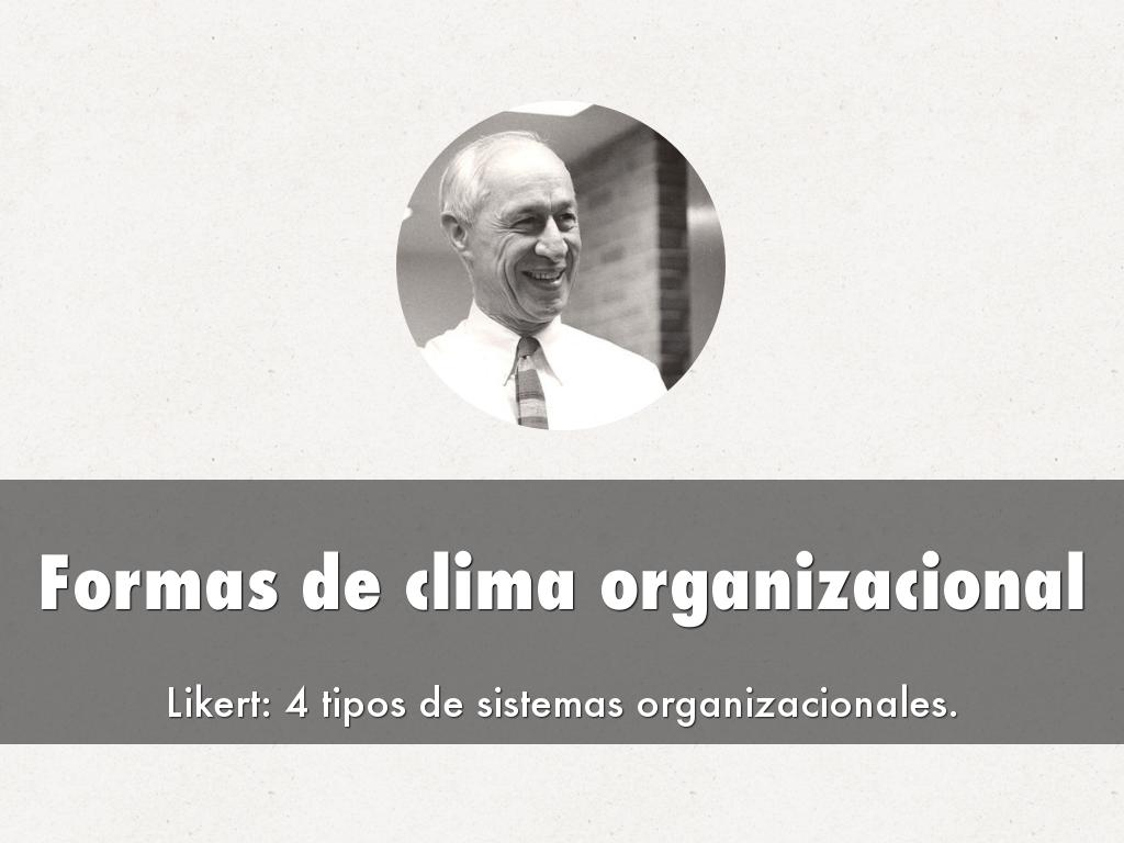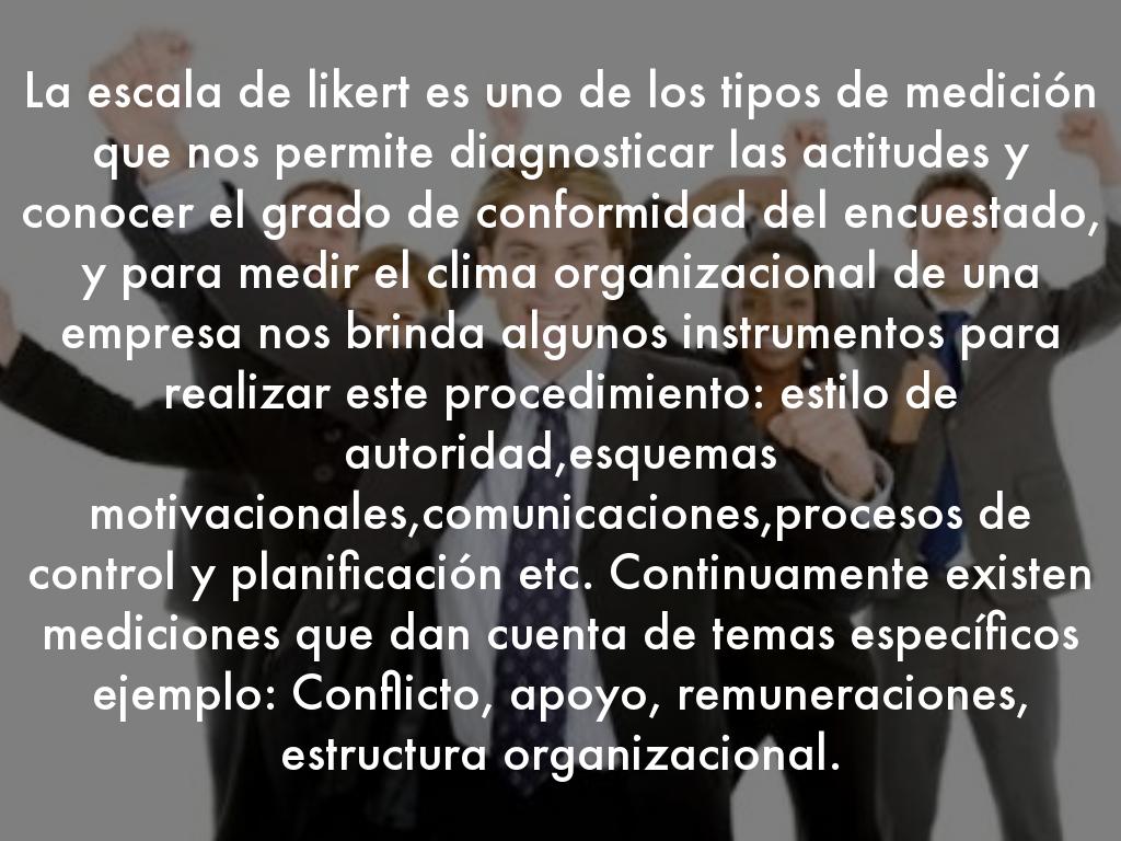 La escala de likert es uno de los tipos de medición que nos permite diagnosticar las actitudes y conocer el grado de conformidad del encuestado, y para medir el clima organizacional de una empresa nos brinda algunos instrumentos para realizar este procedimiento: estilo de autoridad,esquemas motivacionales,comunicaciones,procesos de control y planificación etc. Continuamente existen mediciones que dan cuenta de temas específicos ejemplo: Conflicto, apoyo, remuneraciones, estructura organizacional.
