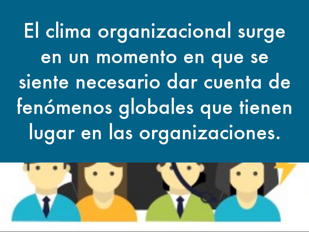 El clima organizacional surge en un momento en que se siente necesario dar cuenta de fenómenos globales que tienen lugar en las organizaciones.