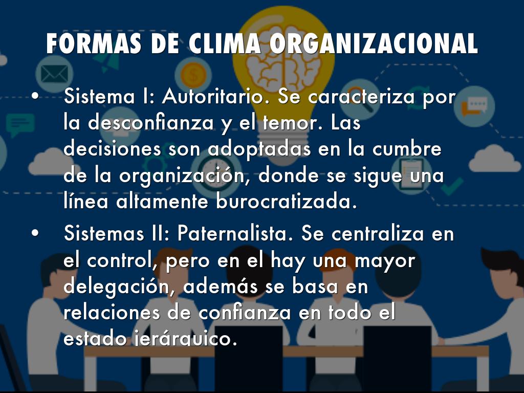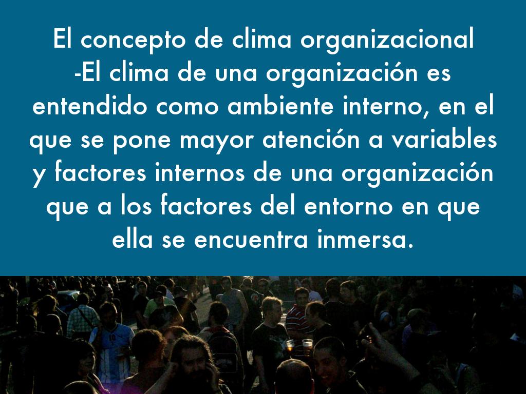 -El clima de una organización es entendido como ambiente interno, en el que se pone mayor atención a variables y factores internos de una organización que a los factores del entorno en que ella se encuentra inmersa.
