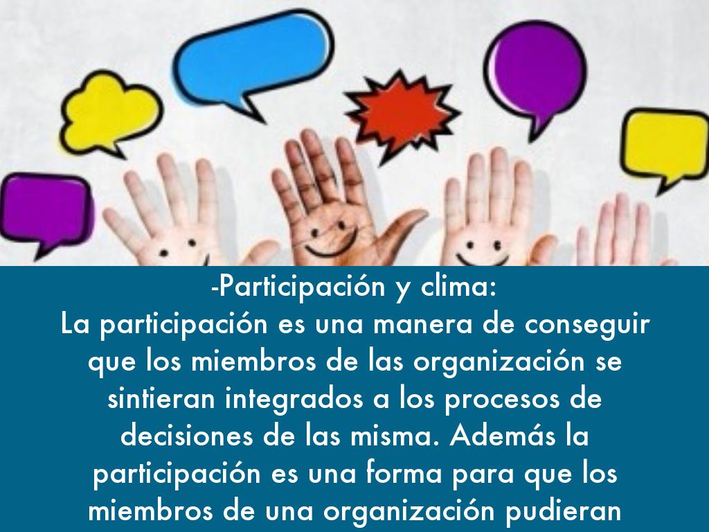 La participación es una manera de conseguir que los miembros de las organización se sintieran integrados a los procesos de decisiones de las misma. Además la participación es una forma para que los miembros de una organización pudieran alcanzar sus niveles de necesidades superiores.