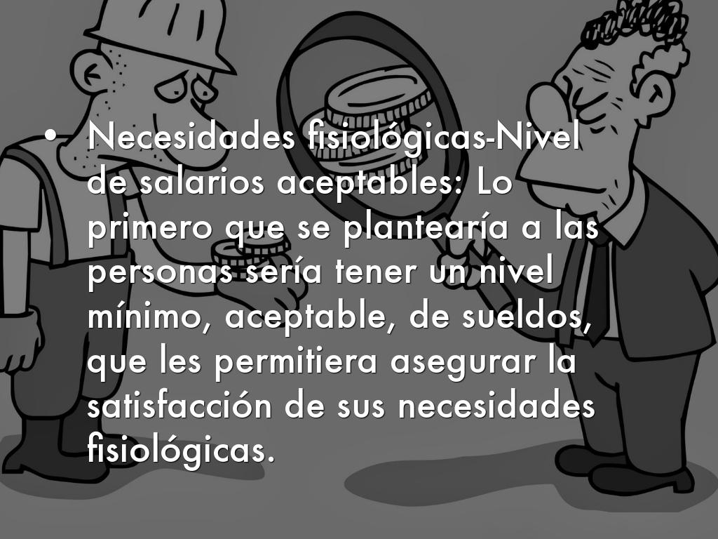 - Necesidades fisiológicas-Nivel de salarios aceptables: Lo primero que se plantearía a las personas sería tener un nivel mínimo, aceptable, de sueldos, que les permitiera asegurar la satisfacción de sus necesidades fisiológicas.