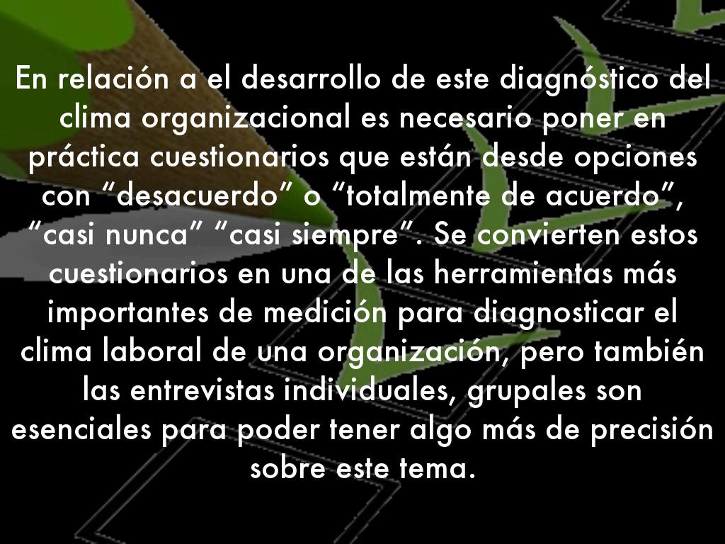 En relación a el desarrollo de este diagnóstico del clima organizacional es necesario poner en práctica cuestionarios que están desde opciones con “desacuerdo” o “totalmente de acuerdo”, “casi nunca” “casi siempre”. Se convierten estos cuestionarios en una de las herramientas más importantes de medición para diagnosticar el clima laboral de una organización, pero también las entrevistas individuales, grupales son esenciales para poder tener algo más de precisión sobre este tema.