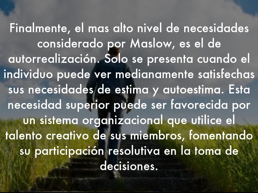 Finalmente, el mas alto nivel de necesidades considerado por Maslow, es el de autorrealización. Solo se presenta cuando el individuo puede ver medianamente satisfechas sus necesidades de estima y autoestima. Esta necesidad superior puede ser favorecida por un sistema organizacional que utilice el talento creativo de sus miembros, fomentando su participación resolutiva en la toma de decisiones.