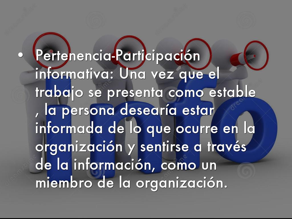 - Pertenencia-Participación informativa: Una vez que el trabajo se presenta como estable , la persona desearía estar informada de lo que ocurre en la organización y sentirse a través de la información, como un miembro de la organización.