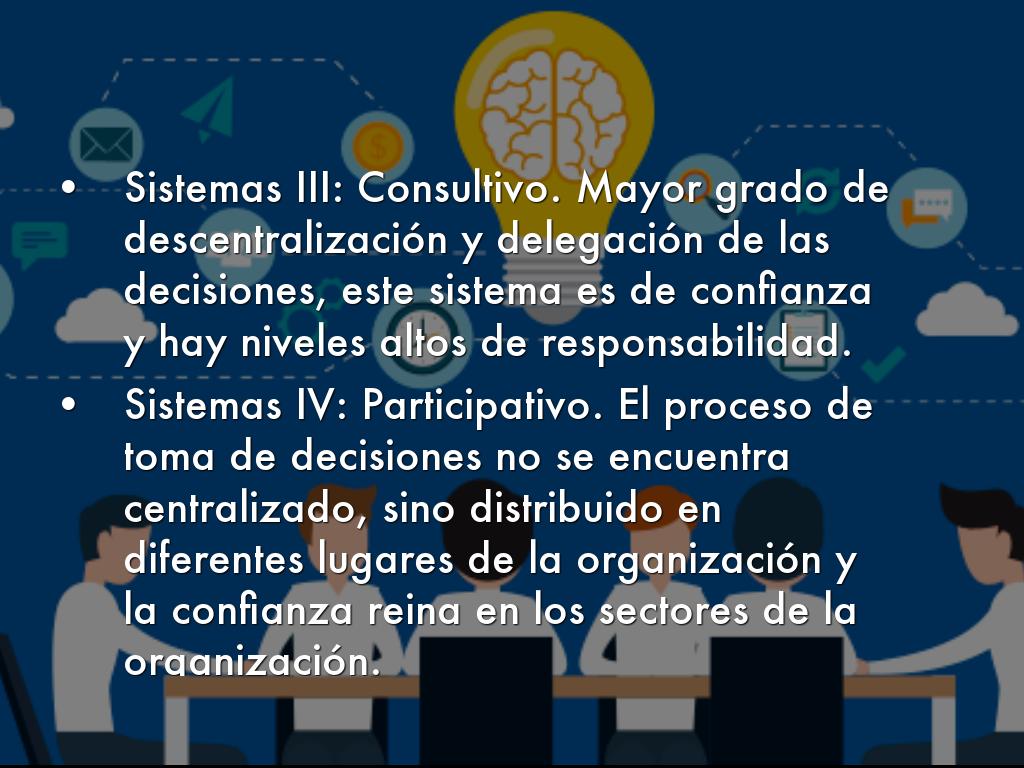 - Sistemas III: Consultivo. Mayor grado de descentralización y delegación de las decisiones, este sistema es de confianza y hay niveles altos de responsabilidad.