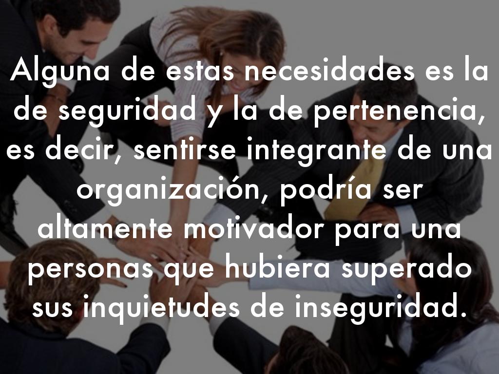 Alguna de estas necesidades es la de seguridad y la de pertenencia, es decir, sentirse integrante de una organización, podría ser altamente motivador para una personas que hubiera superado sus inquietudes de inseguridad.