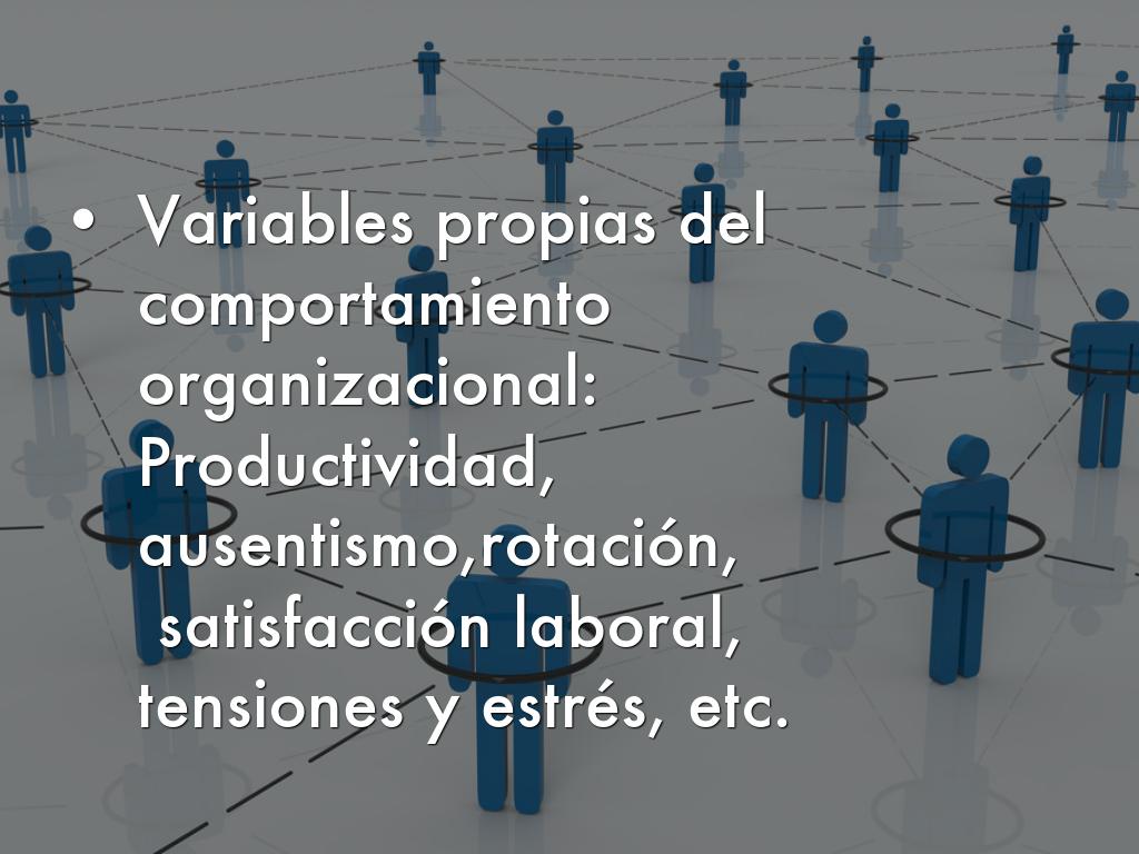 - Variables propias del comportamiento organizacional: Productividad, ausentismo,rotación, satisfacción laboral, tensiones y estrés, etc.