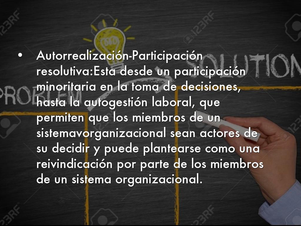 - Autorrealización-Participación resolutiva:Esta desde un participación minoritaria en la toma de decisiones, hasta la autogestión laboral, que permiten que los miembros de un sistemavorganizacional sean actores de su decidir y puede plantearse como una reivindicación por parte de los miembros de un sistema organizacional.