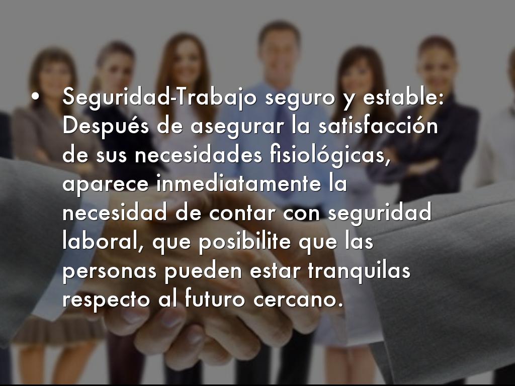 - Seguridad-Trabajo seguro y estable: Después de asegurar la satisfacción de sus necesidades fisiológicas, aparece inmediatamente la necesidad de contar con seguridad laboral, que posibilite que las personas pueden estar tranquilas respecto al futuro cercano.
