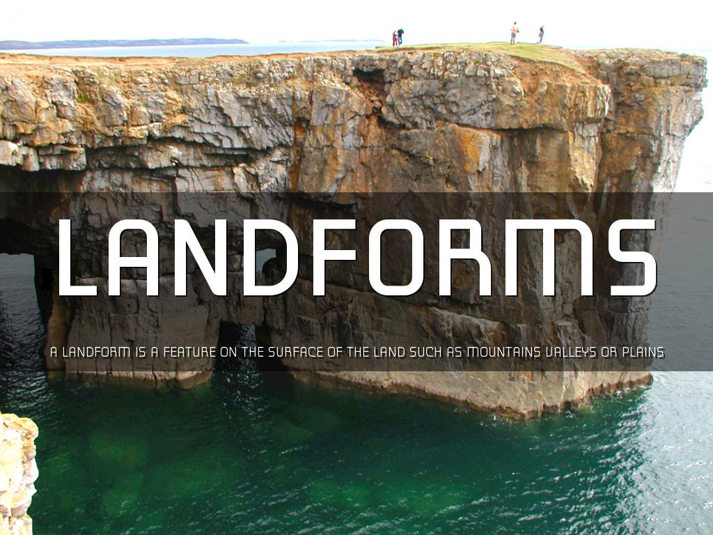A LANDFORM IS A FEATURE ON THE SURFACE OF THE LAND SUCH AS MOUNTAINS VALLEYS OR PLAINS