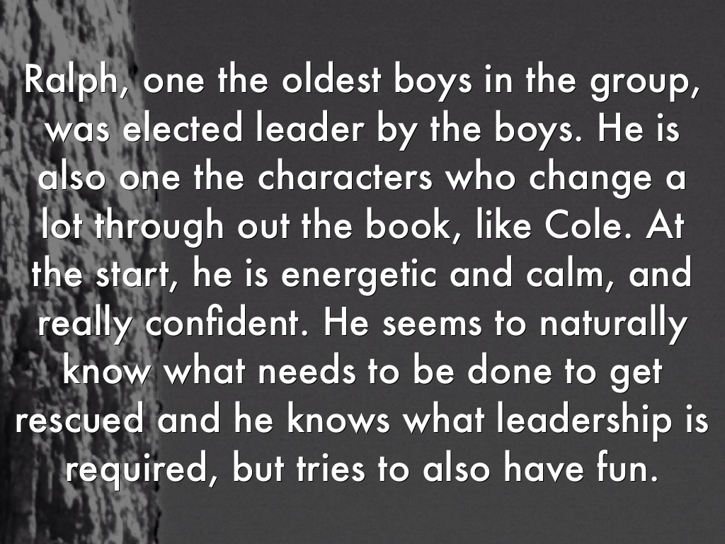 Ralph, one the oldest boys in the group, was elected leader by the boys. He is also one the characters who change a lot through out the book, like Cole. At the start, he is energetic and calm, and really confident. He seems to naturally know what needs to be done to get rescued and he knows what leadership is required, but tries to also have fun.