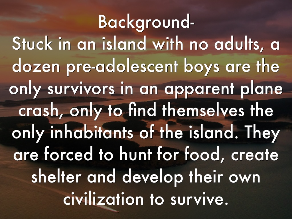 Background- Stuck in an island with no adults, a dozen pre-adolescent boys are the only survivors in an apparent plane crash, only to find themselves the only inhabitants of the island. They are forced to hunt for food, create shelter and develop their own civilization to survive.