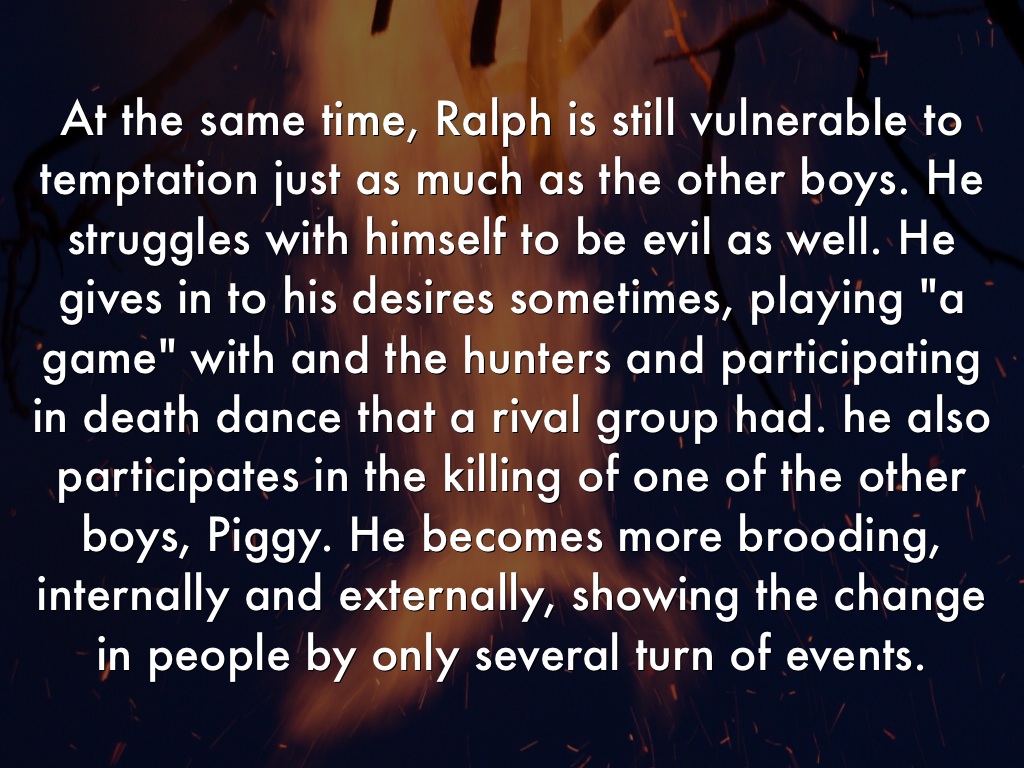 At the same time, Ralph is still vulnerable to temptation just as much as the other boys. He struggles with himself to be evil as well. He gives in to his desires sometimes, playing "a game" with and the hunters and participating in death dance that a rival group had. he also participates in the killing of one of the other boys, Piggy. He becomes more brooding, internally and externally, showing the change in people by only several turn of events.
