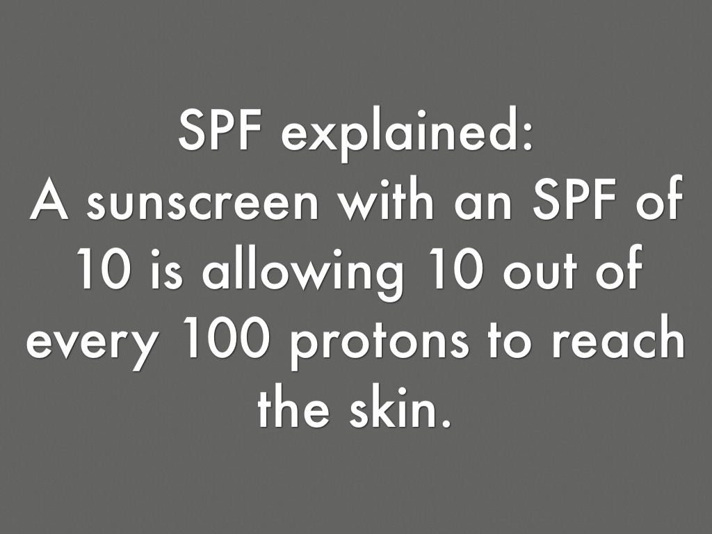 A sunscreen with an SPF of 10 is allowing 10 out of every 100 protons to reach the skin.