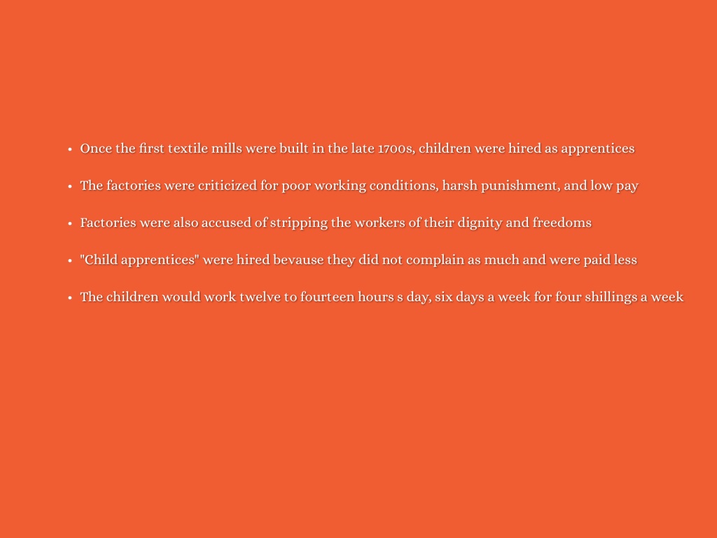 Once the first textile mills were built in the late 1700s, children were hired as apprentices