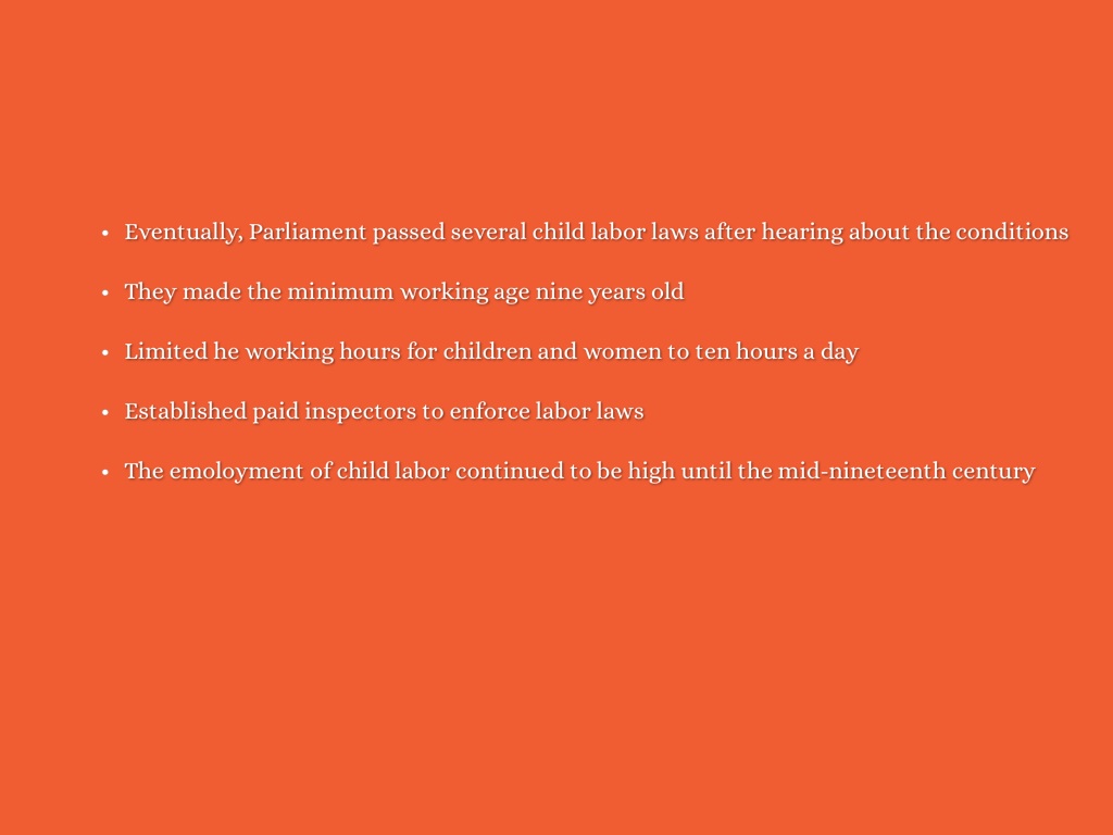 Eventually, Parliament passed several child labor laws after hearing about the conditions