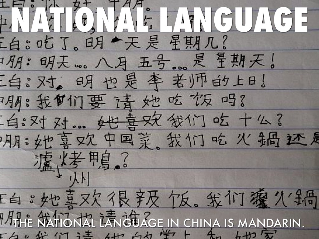 THE NATIONAL LANGUAGE IN CHINA IS MANDARIN.