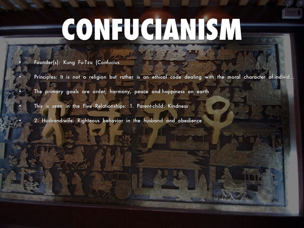 Principles: It is not a religion but rather is an ethical code dealing with the moral character of individuals, society, and government