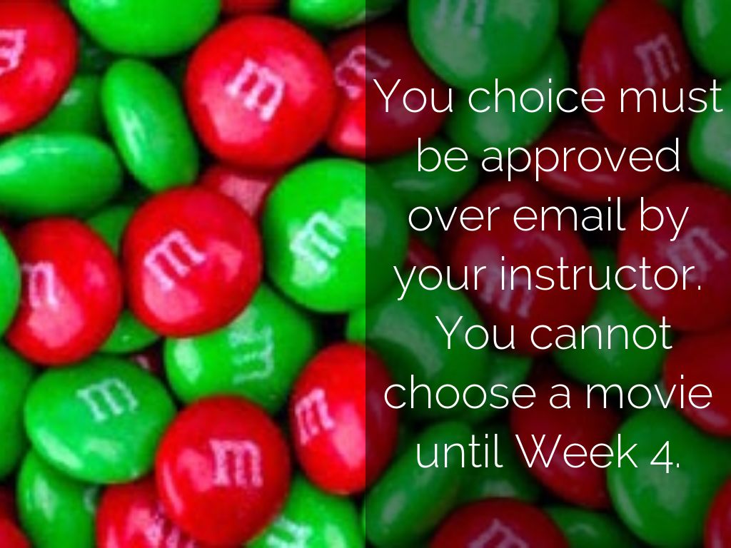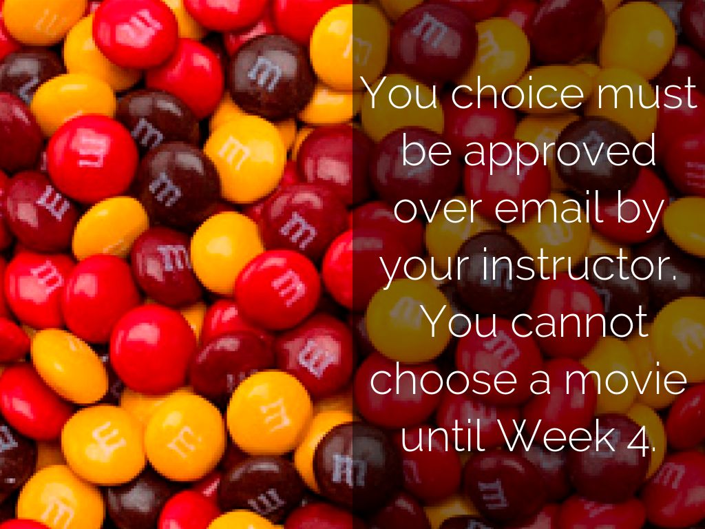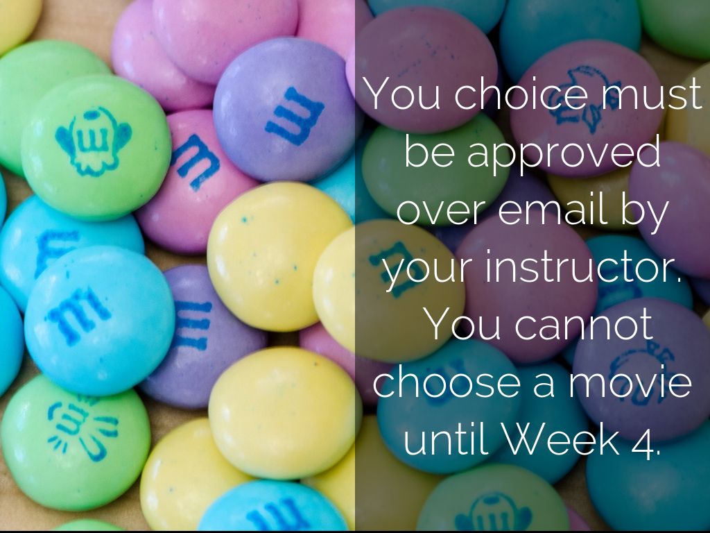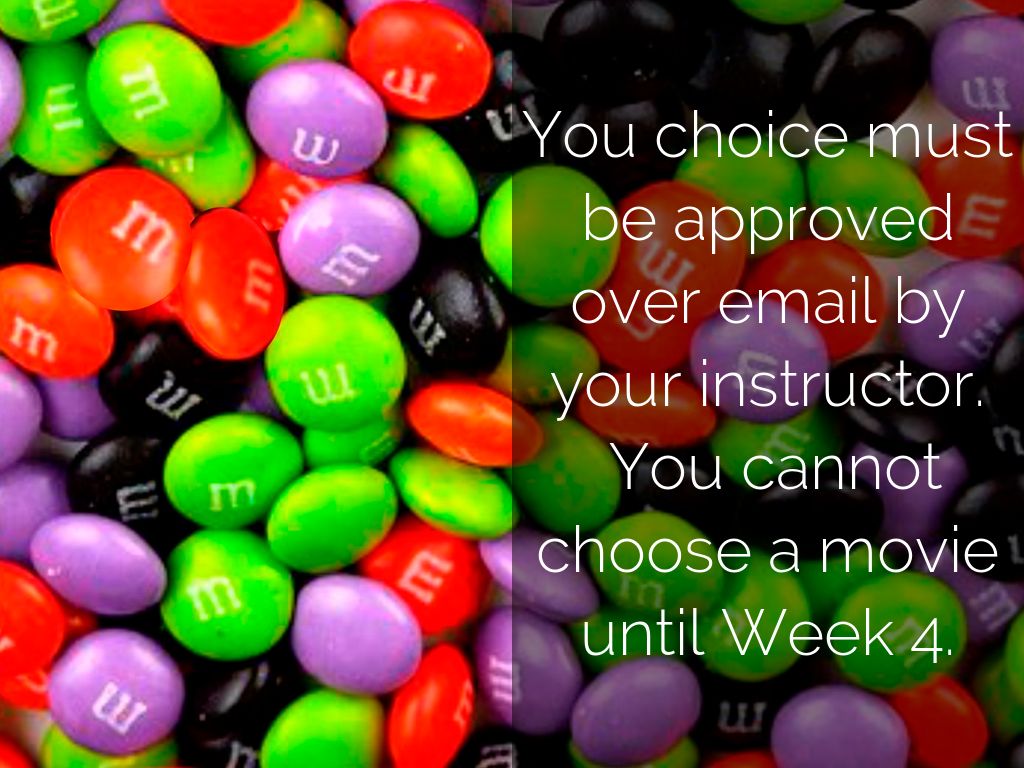 You choice must be approved over email by your instructor. You cannot choose a movie until Week 4.