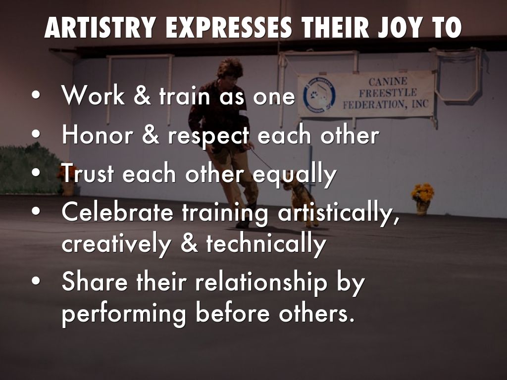 The Canine Freestyle Federation uses Joan Tennille's original training program, CanineFreestyle DogWork, to prepare teams for Freestyle competitions. The competitive sport of Freestyle developed by Joan and The Federation is based on Joan's definition written as an explanation of the new discipline in the Sport of Dogs in October, 1993