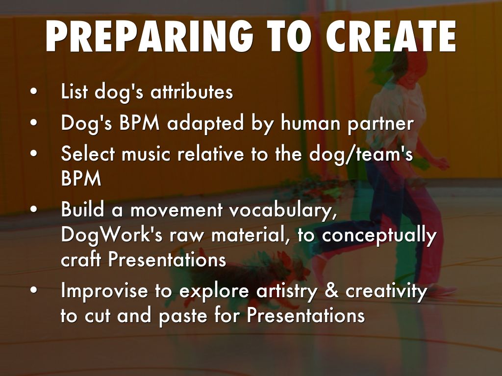 - Build a movement vocabulary, DogWork's raw material, to conceptually craft Presentations