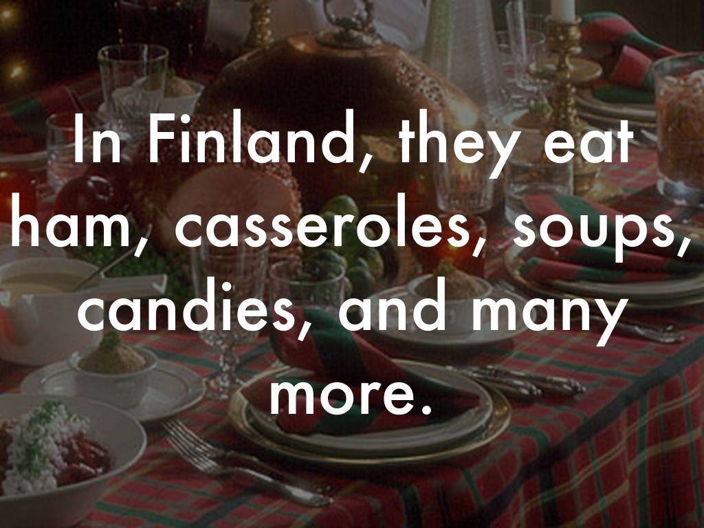 In Finland, they eat ham, casseroles, soups, candies, and many more.