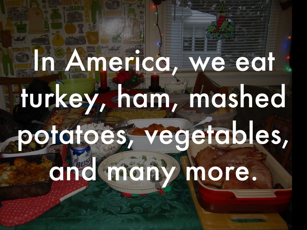 In America, we eat turkey, ham, mashed potatoes, vegetables, and many more.