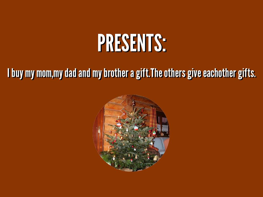 I buy my mom,my dad and my brother a gift.The others give eachother gifts.