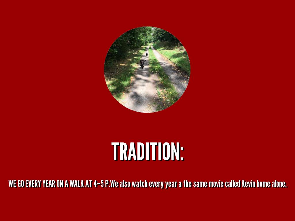 WE GO EVERY YEAR ON A WALK AT 4–5 P.We also watch every year a the same movie called Kevin home alone.