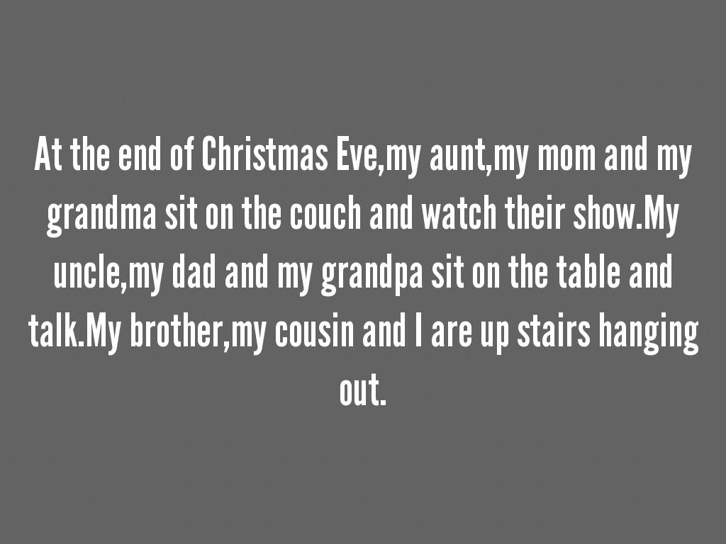 At the end of Christmas Eve,my aunt,my mom and my grandma sit on the couch and watch their