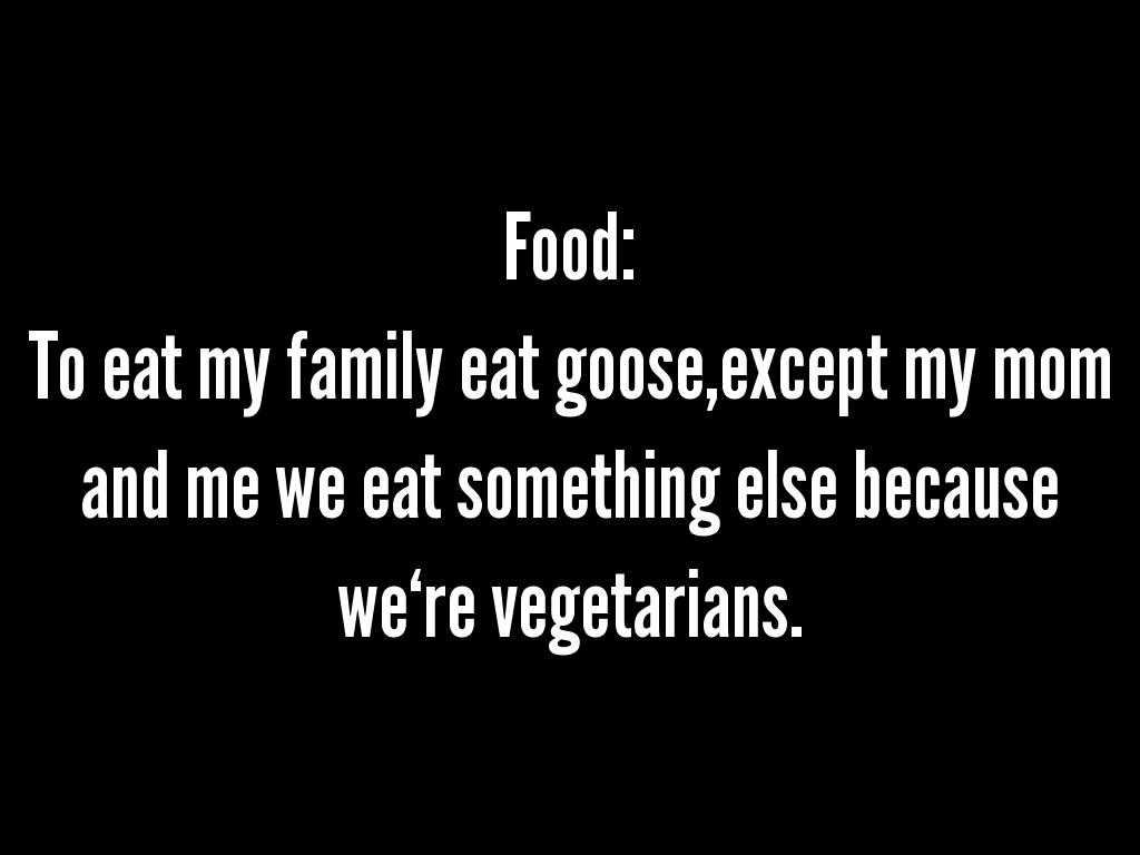 To eat my family eat goose,except my mom and me we eat something else because we‘re vegetarians.