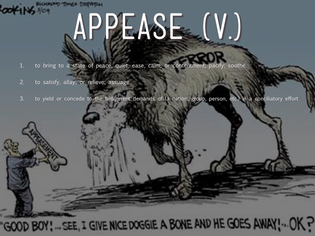 to yield or concede to the belligerent demands of (a nation, group, person, etc.) in a conciliatory effort
