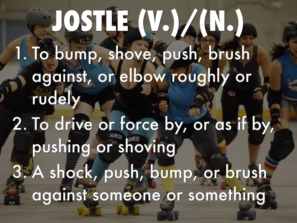 To bump, shove, push, brush against, or elbow roughly or rudely