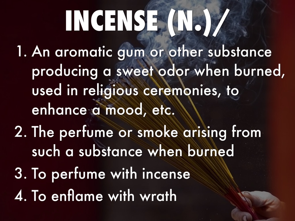An aromatic gum or other substance producing a sweet odor when burned, used in religious ceremonies, to enhance a mood, etc.