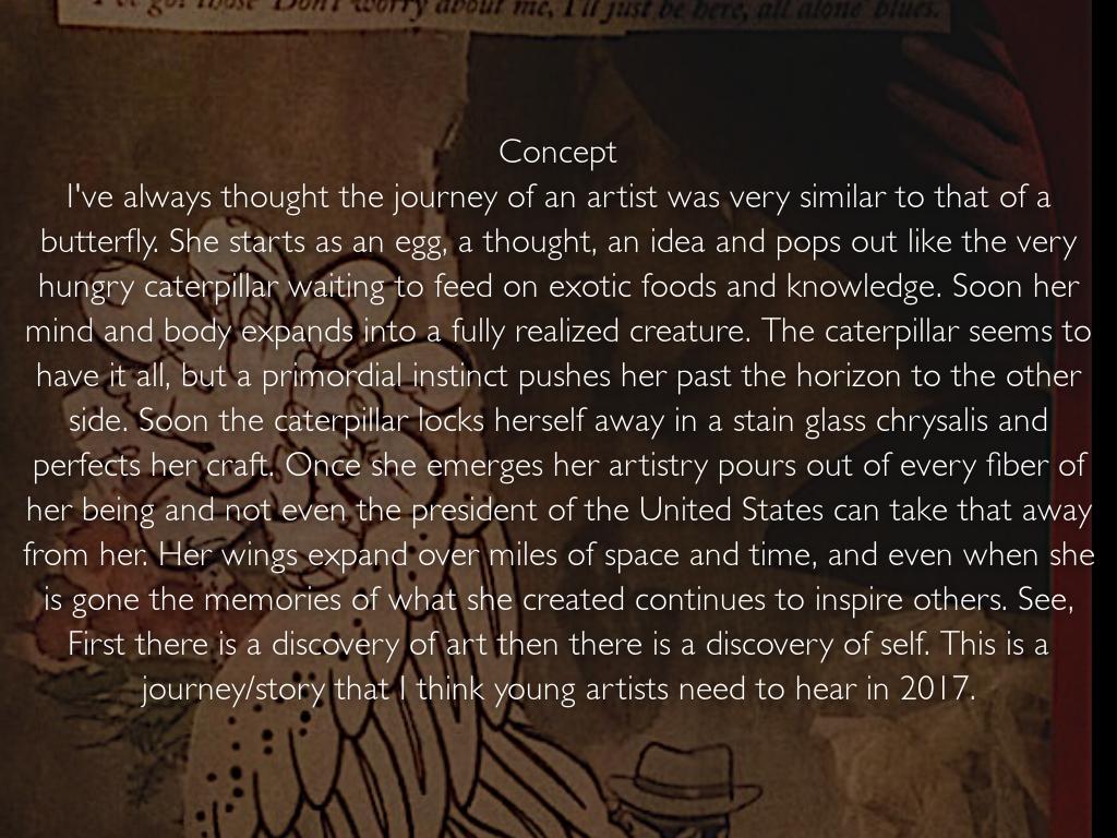 I've always thought the journey of an artist was very similar to that of a butterfly. She starts as an egg, a thought, an idea and pops out like the very hungry caterpillar waiting to feed on exotic foods and knowledge. Soon her mind and body expands into a fully realized creature. The caterpillar seems to have it all, but a primordial instinct pushes her past the horizon to the other side. Soon the caterpillar locks herself away in a stain glass chrysalis and perfects her craft. Once she emerges her artistry pours out of every fiber of her being and not even the president of the United States can take that away from her. Her wings expand over miles of space and time, and even when she is gone the memories of what she created continues to inspire others. See, First there is a discovery of art then there is a discovery of self. This is a journey/story that I think young artists need to hear in 2017.