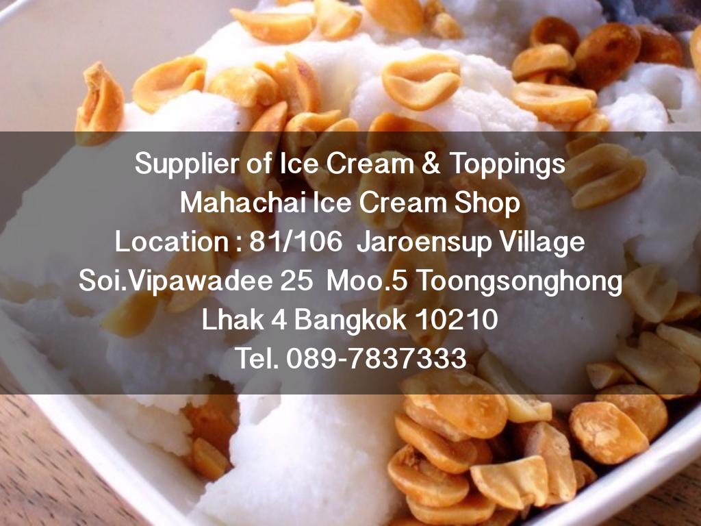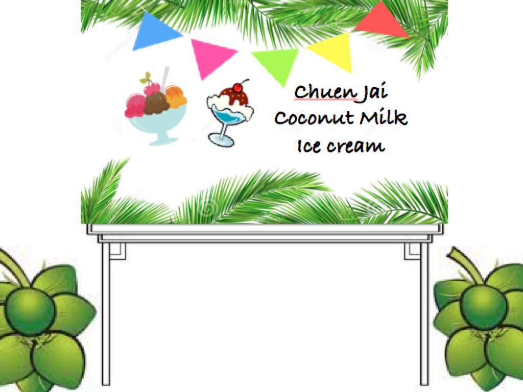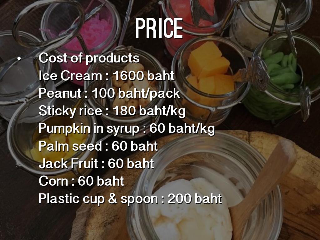 • Cost of products Ice Cream : 1600 baht Peanut : 100 baht/pack Sticky rice : 180 baht/kg Pumpkin in syrup : 60 baht/kg Palm seed : 60 baht Jack Fruit : 60 baht Corn : 60 baht Plastic cup & spoon : 200 baht