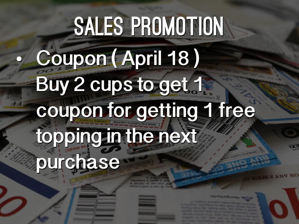 • Coupon ( April 18 ) Buy 2 cups to get 1 coupon for getting 1 free topping in the next purchase