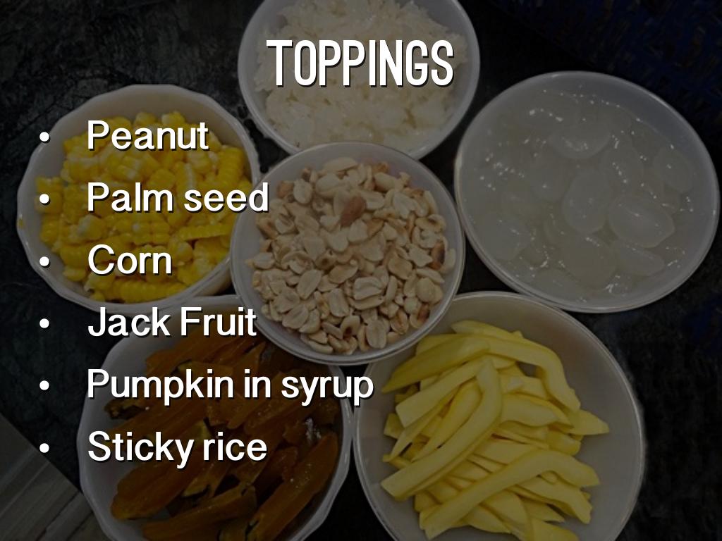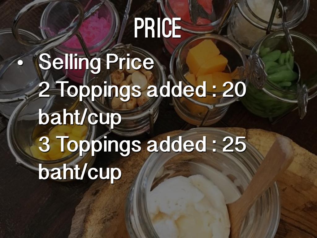 • Selling Price 2 Toppings added : 20 baht/cup 3 Toppings added : 25 baht/cup
