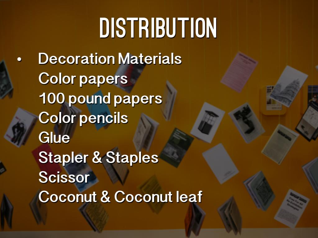 • Decoration Materials Color papers 100 pound papers Color pencils Glue Stapler & Staples Scissor Coconut & Coconut leaf