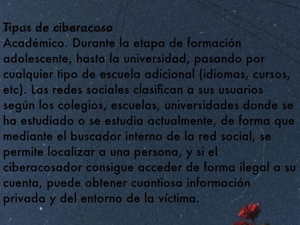 Académico. Durante la etapa de formación adolescente, hasta la universidad, pasando por cualquier tipo de escuela adicional (idiomas, cursos, etc). Las redes sociales clasifican a sus usuarios según los colegios, escuelas, universidades donde se ha estudiado o se estudia actualmente, de forma que mediante el buscador interno de la red social, se permite localizar a una persona, y si el ciberacosador consigue acceder de forma ilegal a su cuenta, puede obtener cuantiosa información privada y del entorno de la víctima.