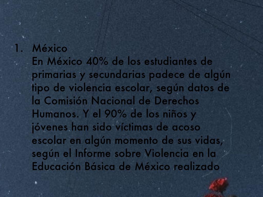 En México 40% de los estudiantes de primarias y secundarias padece de algún tipo de violencia escolar, según datos de la Comisión Nacional de Derechos Humanos. Y el 90% de los niños y jóvenes han sido víctimas de acoso escolar en algún momento de sus vidas, según el Informe sobre Violencia en la Educación Básica de México realizado por la Secretaría de Educación Pública y la UNICEF. El acoso escolar entre los estudiantes mexicanos se manifiesta principalmente con insultos, apodos, rechazo y robo de pertenencias, según la Encuesta Nacional de Intolerancia y Violencia realizada por la Secretaría de Educación Pública. Aunque en el cyberbullying los insultos y amenazas también se encuentran presentes, el hostigamiento no se limita al horario escolar y las víctimas se encuentran vulnerables y disponibles 24 horas al día.