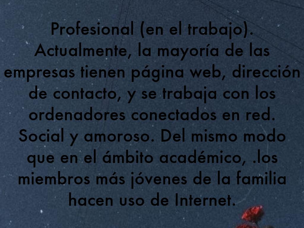 Profesional (en el trabajo). Actualmente, la mayoría de las empresas tienen página web, dirección de contacto, y se trabaja con los ordenadores conectados en red.