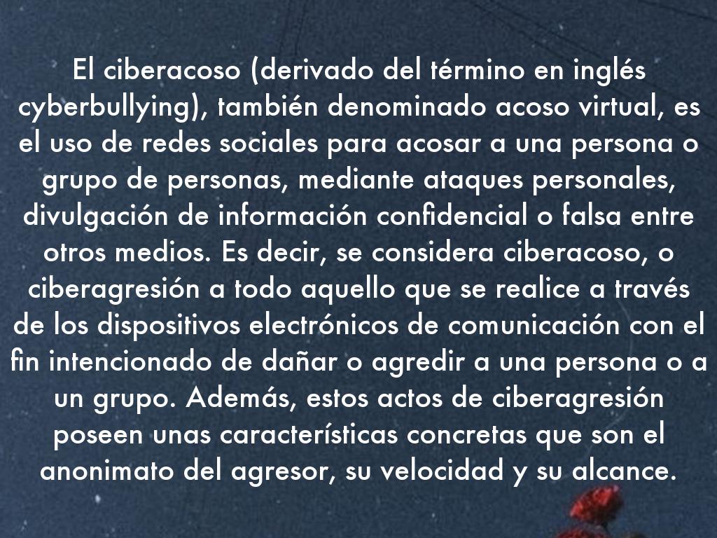 El ciberacoso (derivado del término en inglés cyberbullying), también denominado acoso virtual, es el uso de redes sociales para acosar a una persona o grupo de personas, mediante ataques personales, divulgación de información confidencial o falsa entre otros medios. Es decir, se considera ciberacoso, o ciberagresión a todo aquello que se realice a través de los dispositivos electrónicos de comunicación con el fin intencionado de dañar o agredir a una persona o a un grupo. Además, estos actos de ciberagresión poseen unas características concretas que son el anonimato del agresor, su velocidad y su alcance.