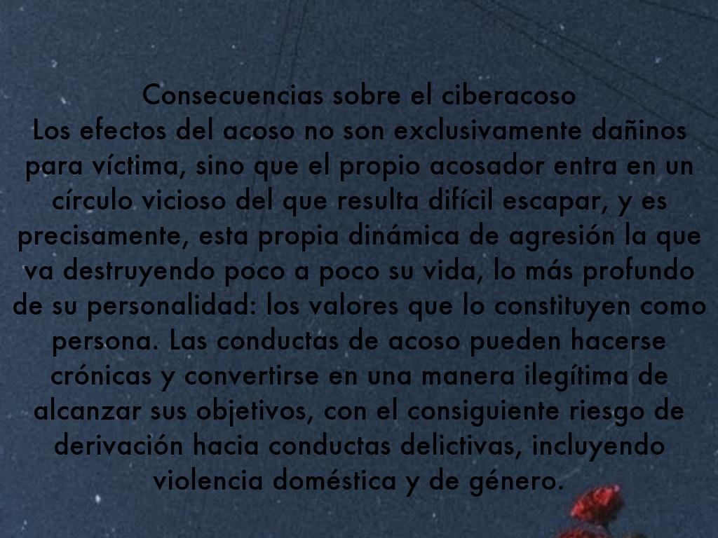 Los efectos del acoso no son exclusivamente dañinos para víctima, sino que el propio acosador entra en un círculo vicioso del que resulta difícil escapar, y es precisamente, esta propia dinámica de agresión la que va destruyendo poco a poco su vida, lo más profundo de su personalidad: los valores que lo constituyen como persona. Las conductas de acoso pueden hacerse crónicas y convertirse en una manera ilegítima de alcanzar sus objetivos, con el consiguiente riesgo de derivación hacia conductas delictivas, incluyendo violencia doméstica y de género.