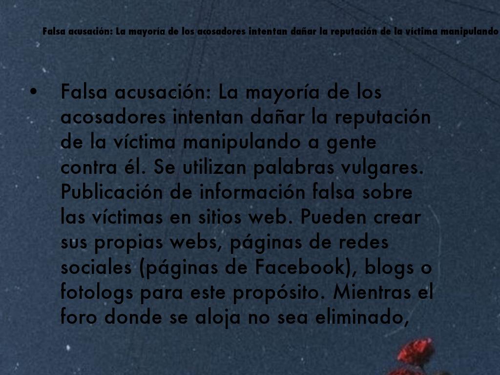 - Falsa acusación: La mayoría de los acosadores intentan dañar la reputación de la víctima manipulando a gente contra él. Se utilizan palabras vulgares.