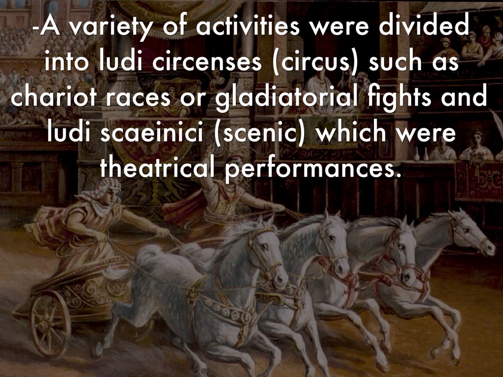 -A variety of activities were divided into ludi circenses (circus) such as chariot races or gladiatorial fights and ludi scaeinici (scenic) which were theatrical performances.